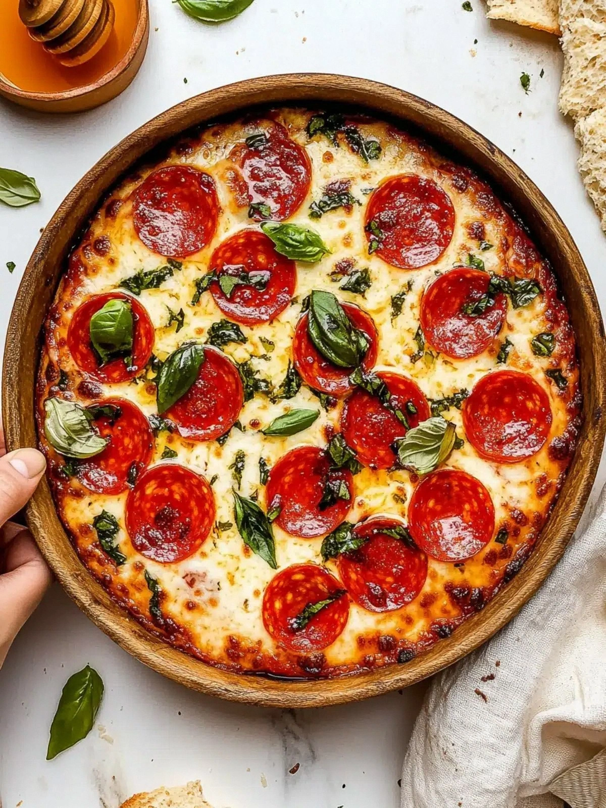- Transfer the cheese mixture to a small baking dish or a cast‑iron skillet. Spread the mixture evenly, then top with the toasted baguette slices, pepperoni slices, and fresh basil leaves. Drizzle the 2 tablespoons hot honey over the entire surface, letting it pool in the gaps between the slices.