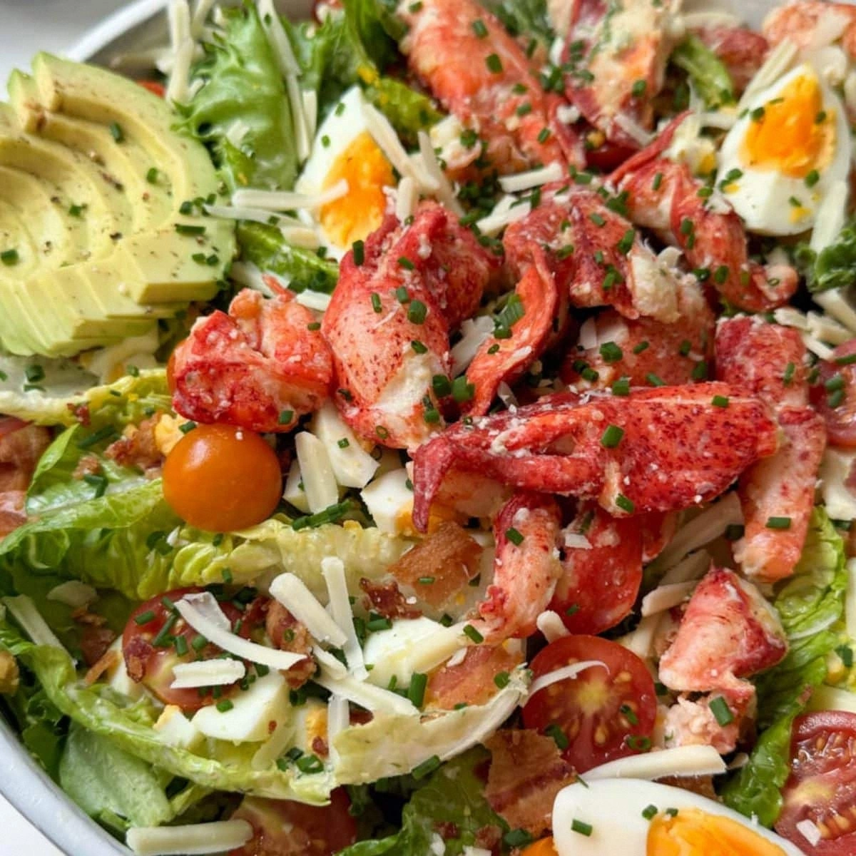 - In a large mixing bowl, combine the crisp gem lettuce, shredded lobster, bacon pieces, avocado cubes, cherry tomatoes, scallions, and cheddar shards. Pour the dressing over the mixture and toss gently but thoroughly, ensuring every leaf and bite is coated. The dressing should cling to the salad like a silk veil, giving each bite a burst of flavor.