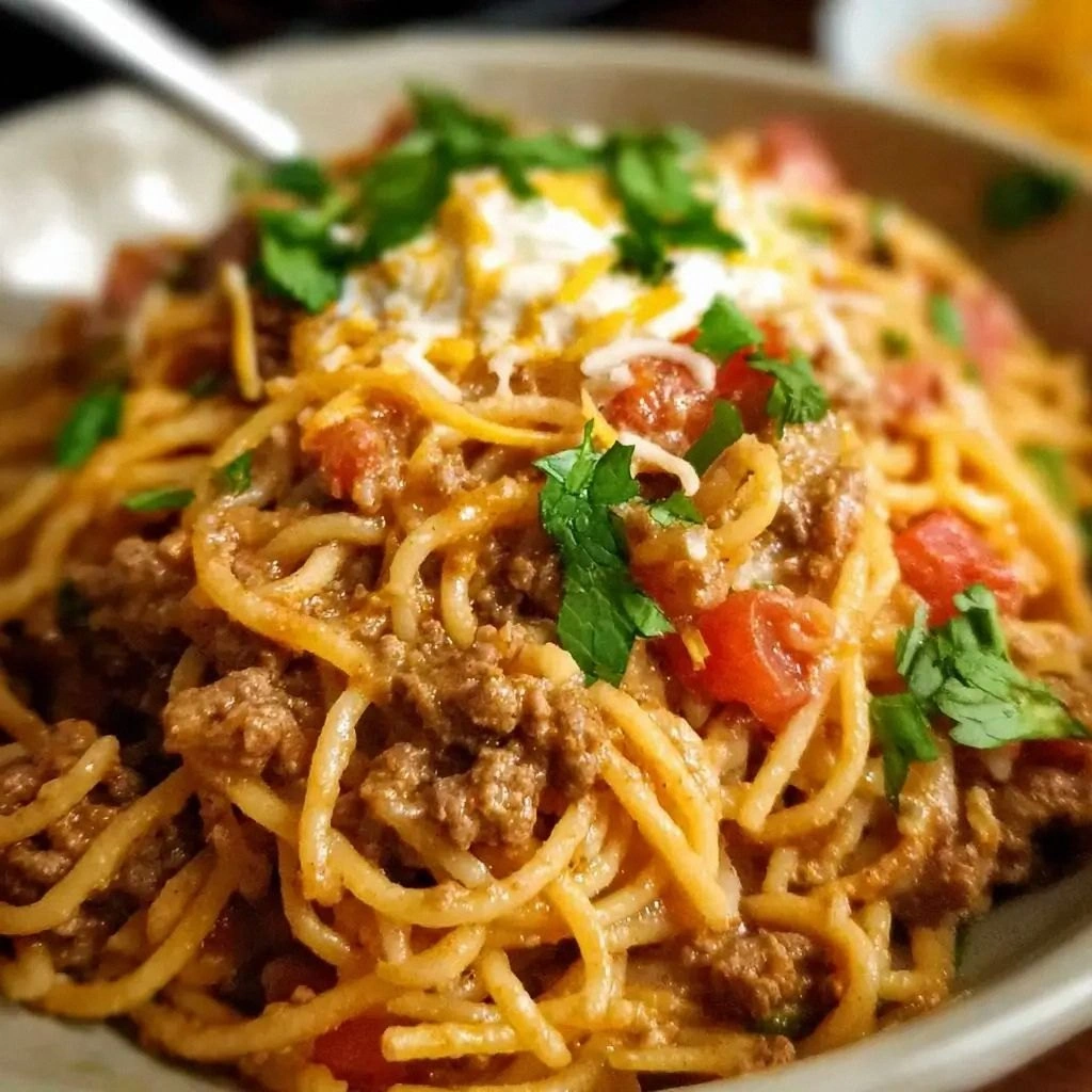 Swap the spaghetti for corn tortillas: Warm the tortillas in a skillet and fill them with the taco‑spaghetti mixture. Top with fresh salsa, avocado, and a squeeze of lime for a street‑style experience. This variation turns the dish into a handheld fiesta.