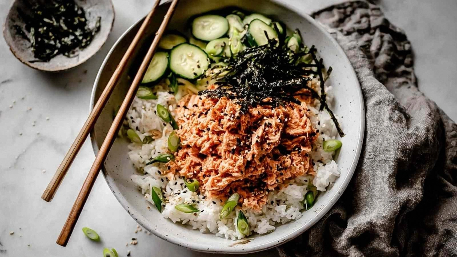 Picture the moment when the rice hits the plate: fluffy grains glistening with a faint sheen of sesame, the air thick with the aroma of toasted rice vinegar and soy. The tuna mixture slides onto it, a velvety spread that coats each grain like a silk scarf. The cucumber slices cut through the richness, offering a crisp, refreshing counterpoint that feels like a breath of fresh air. The avocado, sliced thin, adds a buttery softness that melts in your mouth, while the green onions provide a bright, almost citrusy zing that lifts the entire dish. The final flourish of toasted sesame seeds adds a nutty crunch, a subtle pop that reminds you that this bowl is more than just a meal—it’s a sensory experience.